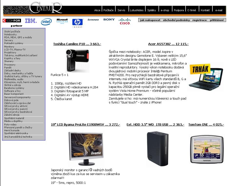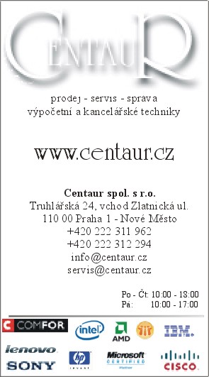 Centaur spol. s r.o.Prodej, servis PC, správa počítačů, datových sítí, komponent a periferií.Opravy počítačů, správa a výstavba firemních sítí za rozumné ceny. Prodej komponent a počítačů na splátky. Vše ve středu Prahy.